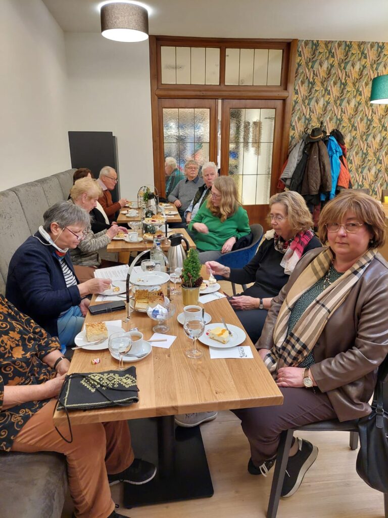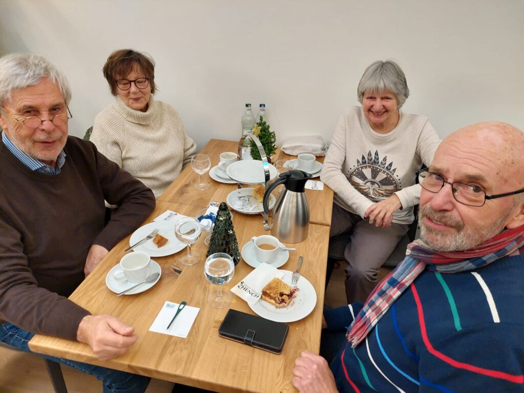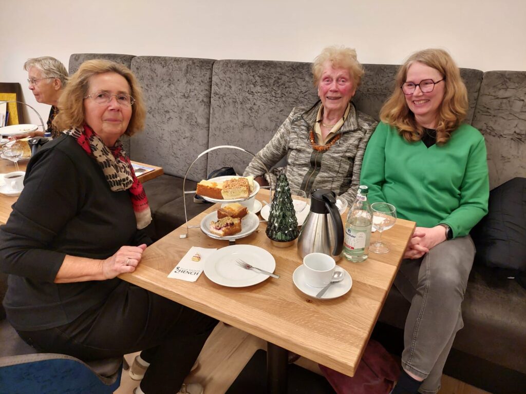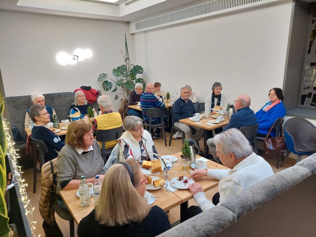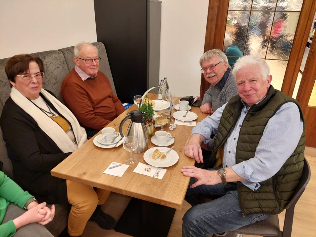 Am 4. Dezember war es soweit, das erste Treffen zum 1. Adventskaffee fand im sehr schön dekorierten Nebenraum des Cafe Hench statt. Bei Kaffee und Kuchen waren wir sehr schnell in angeregte Gespräche vertieft. Peter Reuter, ein früherer Kollege mit herausragender musikalischer Begabung sorgte für eine Wohlfühlatmosphäre und schnell wurde er gebeten mit uns eine paar Weihnachtslieder zu singen. Da glänzte der ein und andere mit wunderschöner Stimme und es machte allen sichtlich viel Freude.